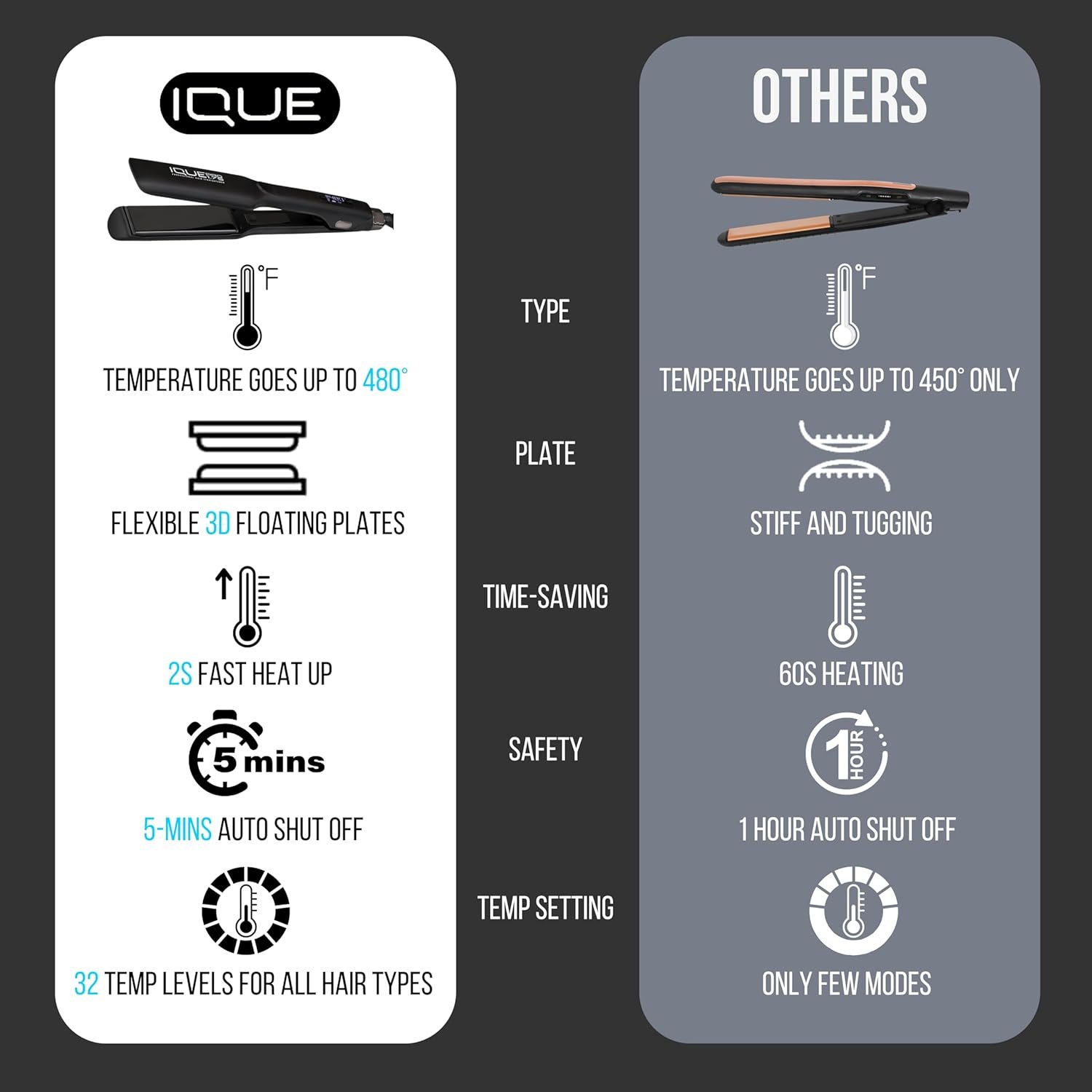 COLOR Black TEMP SETTINGS 32 Settings 140℉ – 458℉ HEAT-UP TIME 2s STYLING FINISH Silky straight hair / Bouncy curls SUITABLE HAIR TYPES All types KEY FEATURE 3D floating plates, Nano Titanium plates POWER SOURCE Corded Electric HEATER SURFACE MATERIAL Titanium TURN OFF METHOD Automatically turn off within 5 minutes of non-movement