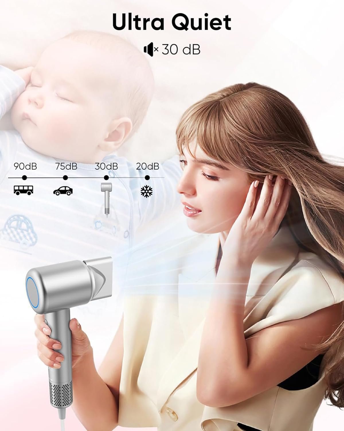 Powerful Motor and Thermo control technology: Our blow dryer with diffuser has advanced intelligent temperature control. The air temperature changes more than 100 times per second, which protects your hair from damage caused by overheating. We optimize the motor and air duct, sound is carefully modulated to reduce sharp noise and provide a pleasant hair drying experience