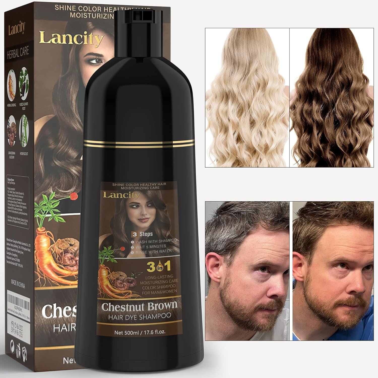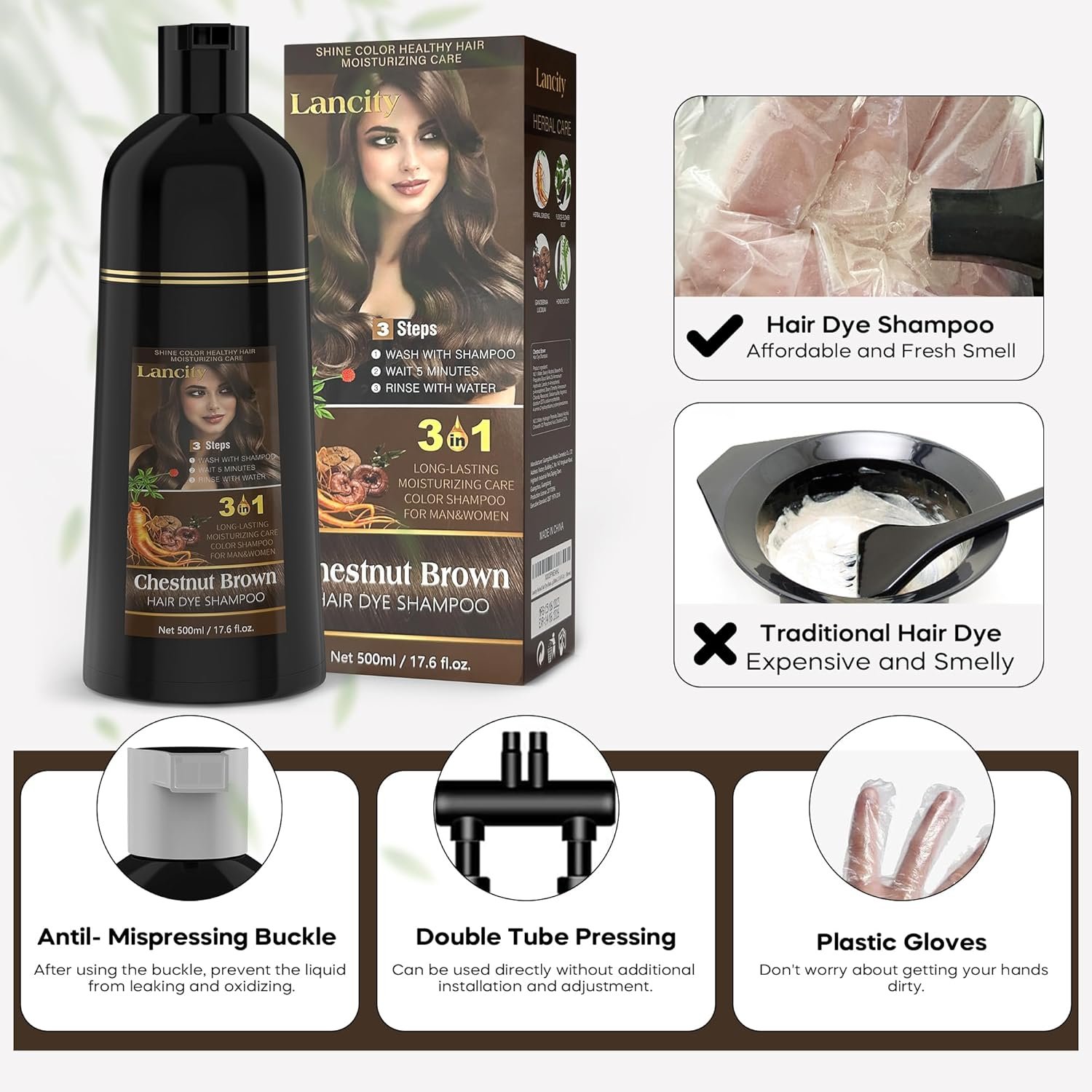 Hair Dye Shampoo 3-In-1 Hair Color Shampoo Instant Coloring Gray Hair Coverage Nature Herbal treated for Men and Women (500mL,17.6 Fl Oz) (Chestnut Brown)