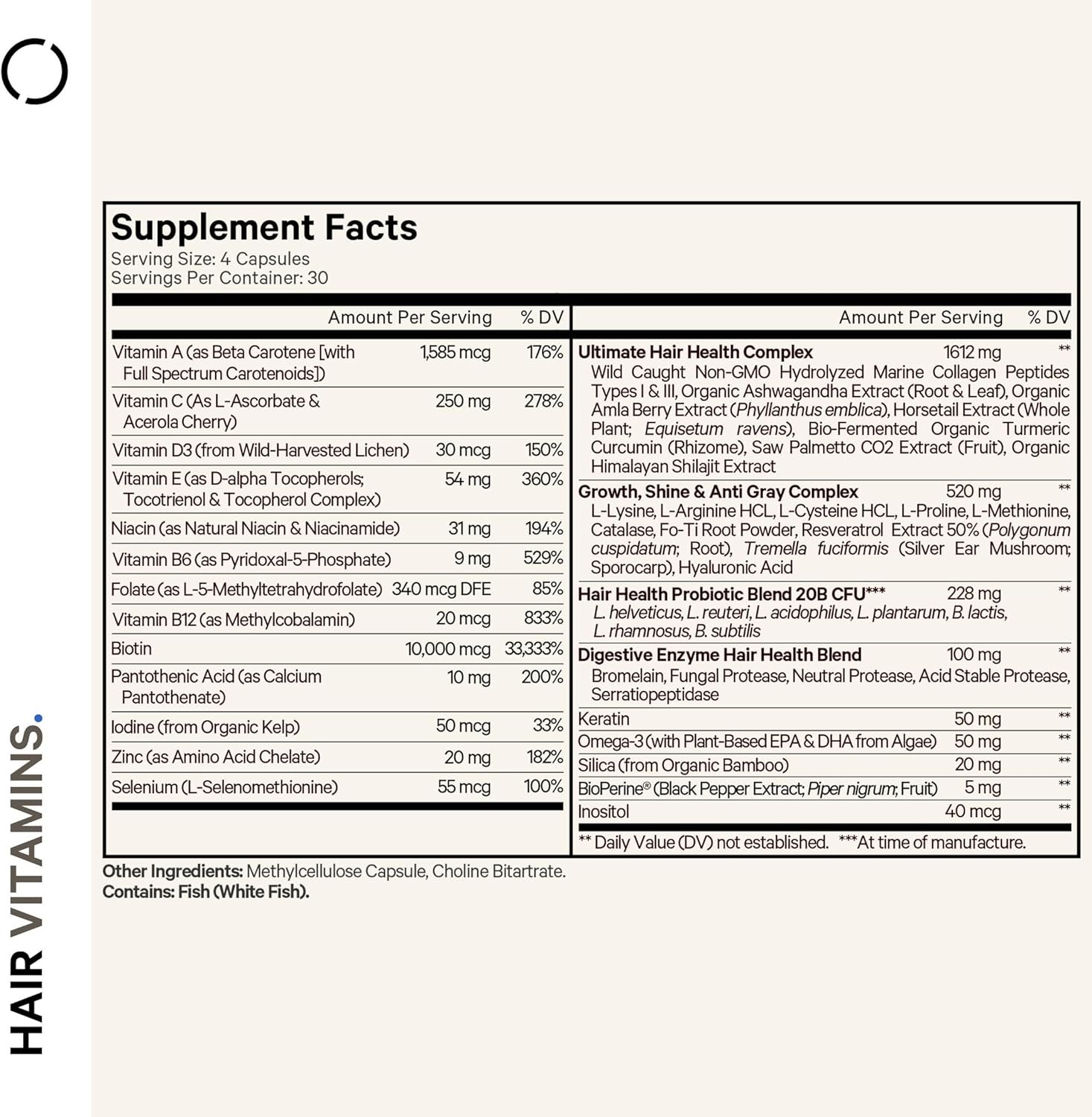 Comprehensive Hair Nutrient Blend: Codeage Hair Vitamins supplement features 10,000 mcg of biotin, hydrolyzed wild-caught marine collagen types I and III, keratin, and essential vitamins A, B6, B12, C, D3, and E—all in one formula to complement your hair care routine. It also includes omega-3 with plant-based EPA and DHA.