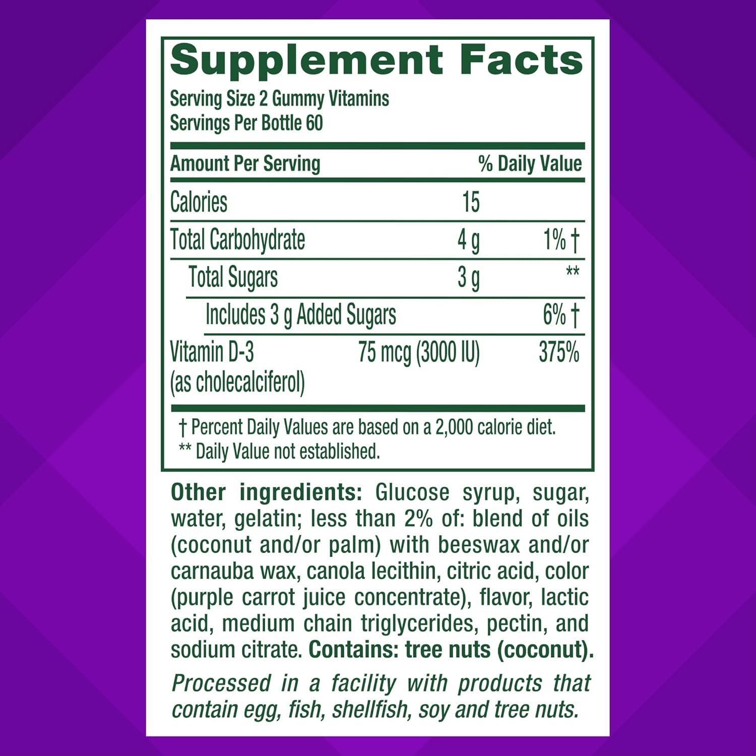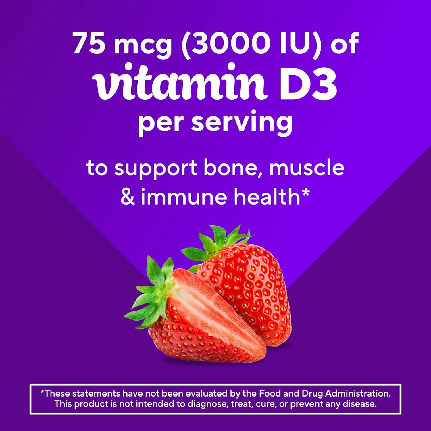 Includes: One 120 ct bottle of vitafusion Extra Strength Vitamin D3 Gummy Vitamins, Strawberry Flavored Bone and Immune System Support Vitamins (1) (60 Day Supply)